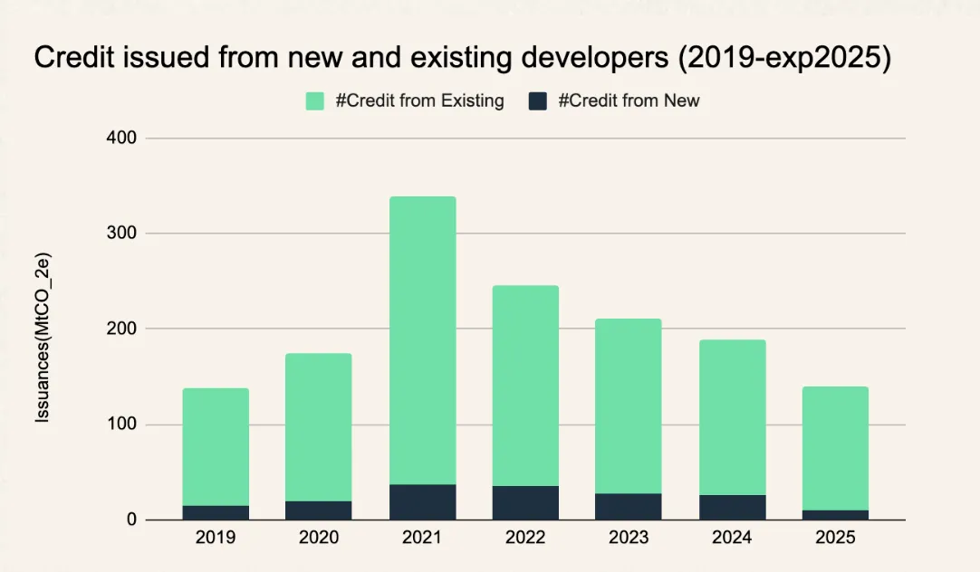 More players entering: Over 100 new developers issued credits in 2024. The top 10 developers now account for just 23% of supply—a sign of a more diverse, less concentrated market.