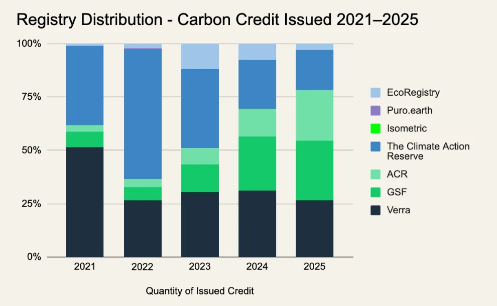 Registries on the move: Verra’s output has fallen sharply since its 2021 peak. Gold Standard is gaining steadily, with newer registries like Isometric and Puro.earth quietly making progress.