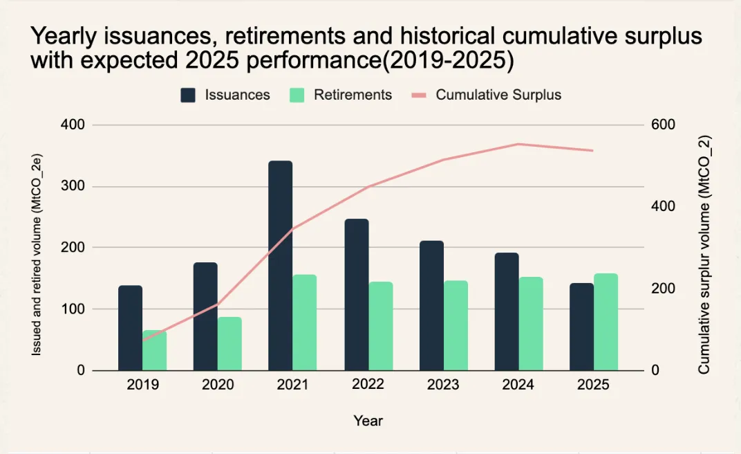 Market balance is shifting: Credit issuances dropped 10% from 2023 to 2024, while retirements kept growing.